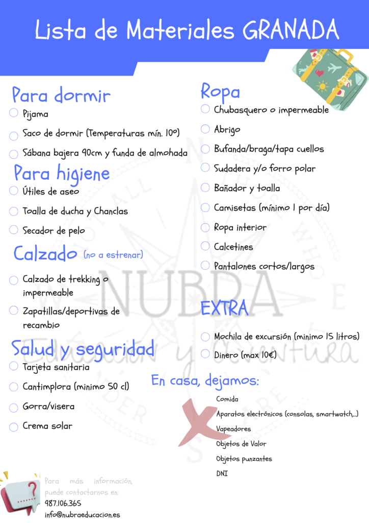 Recordatorio: en ningún caso la maleta puede ser sustituida por la mochila. Esta última la usaremos para meter lo necesario para la clase de surf, agua, crema de sol,….